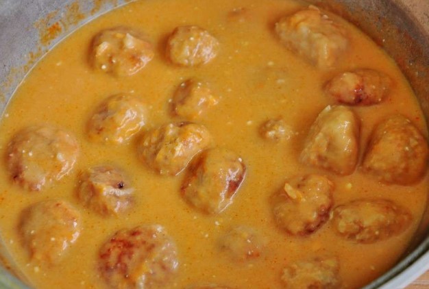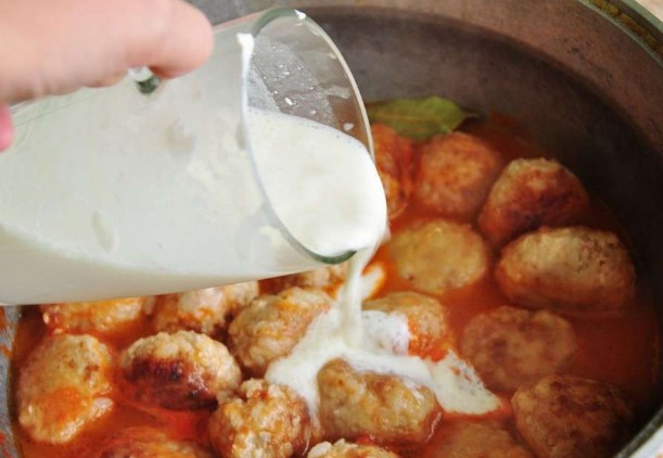 Giet de zure roomsaus in een pan met gehaktballen, meng voorzichtig en laat de gehaktballen ongeveer twintig minuten of een half uur sudderen onder een gesloten deksel.