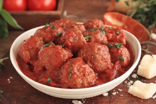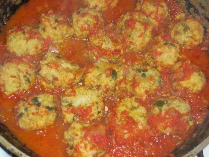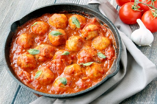 - Visballetjes in een pan met tomatensaus