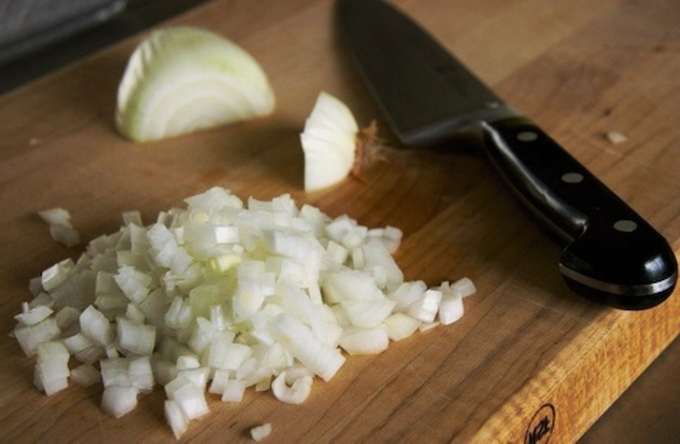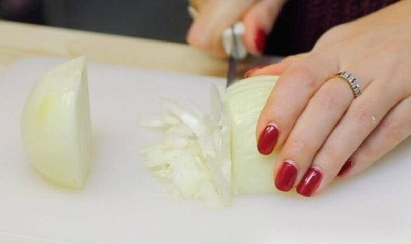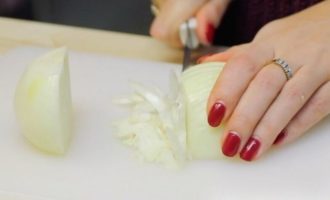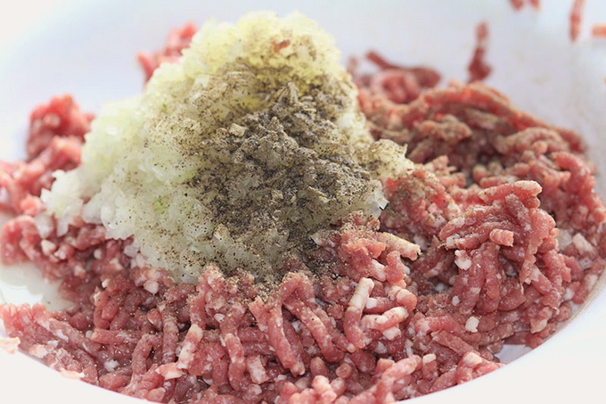 - Hak een of twee uien heel fijn, voeg toe aan het gehakt, meng.