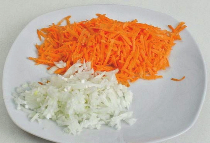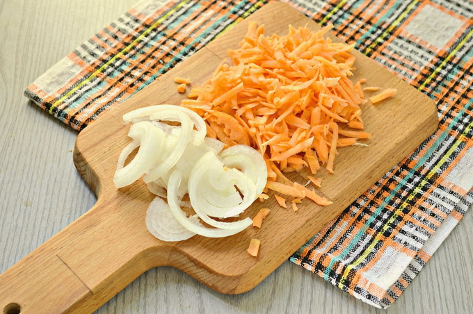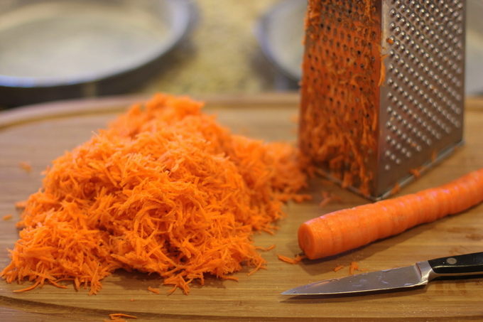 - Snijd de ui in halve ringen en rasp de wortel.