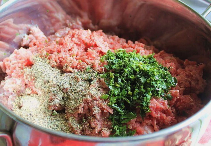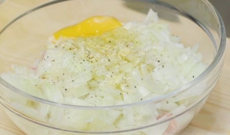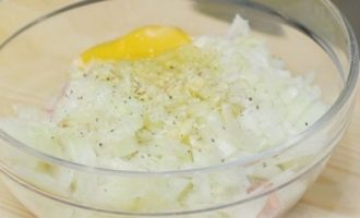 - Zout het gehakt, breng op smaak, maar voeg een beetje kruiden toe, voeg een rauw ei toe en meng goed.