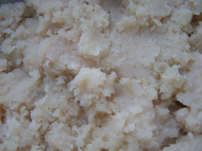 - Haal de visfilet door een vleesmolen, voeg boter (zacht), ei, kruiden en gezwollen havermout toe, breng het gehakt op smaak met kruiden, zout en meng goed.