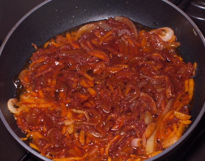 - Snipper voor de jus de ui en rasp de wortelen. Indien gewenst kunt u paprika's, in reepjes gesneden, evenals verse tomaten of tomatenpuree aan de jus toevoegen.