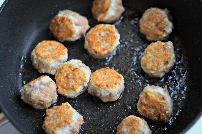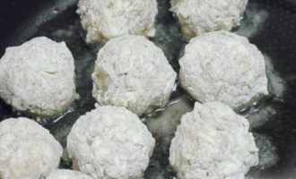 - Maak kleine gehaktballetjes, rol ze door bloem en bak ze in hete plantaardige olie, zodat ze aan elke kant worden gebakken tot een mooie korst.
