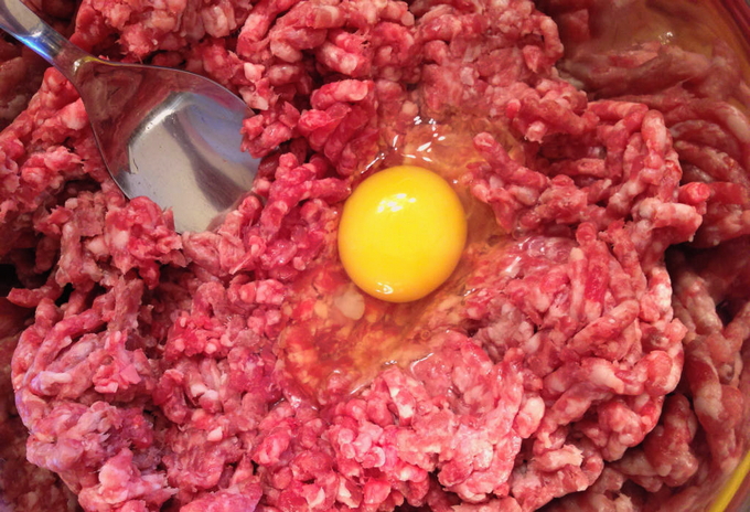 - Voeg tot slot een kippenei toe aan het gehakt, roer tot een gladde massa.