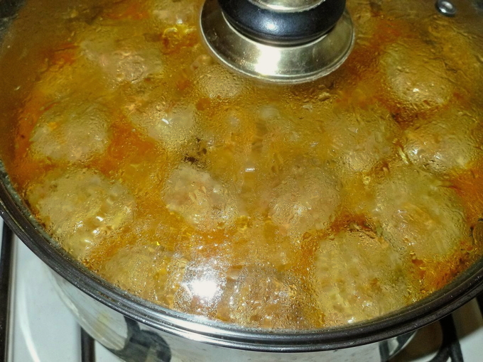 - Giet de jus gehaktballetjes en laat ze onder het deksel 15-20 minuten sudderen.