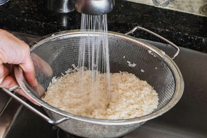 - Kook de rijst van tevoren in gezouten water gaar en giet het overtollige water af, maar spoel de rijst niet af.