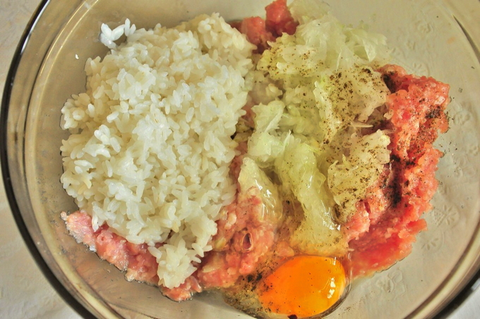 - Voeg rijst toe aan het gehakt, roer door als het een beetje is afgekoeld.