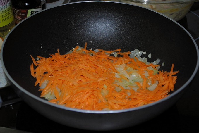 - Bak de uien en wortelen in een beetje plantaardige olie.