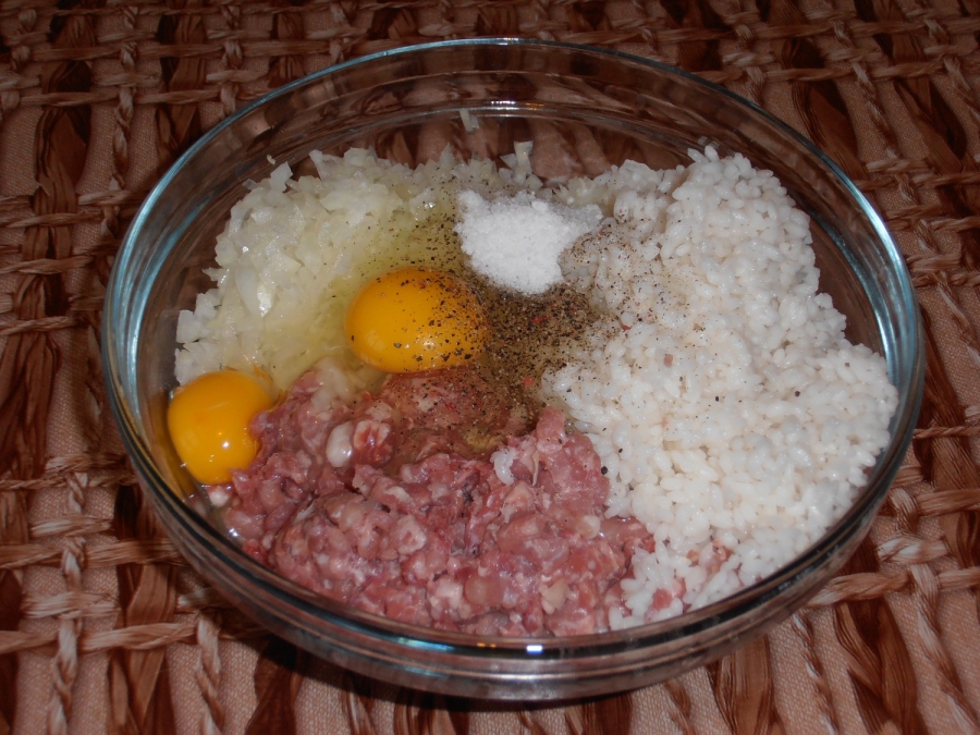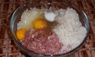- Als je gehakt gebruikt, meng het dan met gekookte rijst, nat brood, zout, peper en kruiden. Als u een heel stuk vlees gebruikt, spoel het dan eerst onder stromend water en haal het vervolgens door een vleesmolen (het is beter om niet één, maar meerdere soorten vlees te gebruiken).