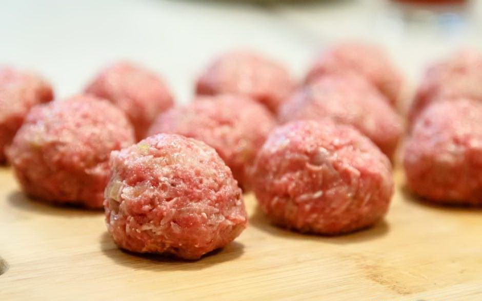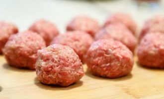 - Bevochtig je handen in koud water, pluk kleine stukjes van het gehakt, vorm er mooie ronde gehaktballen van.