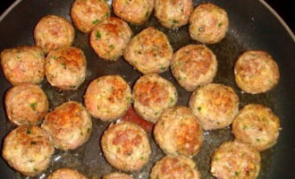 - Zet het fornuis aan, zet een koekenpan met gegoten plantaardige olie erop. Als de olie heet genoeg is, doe je de gehaktballetjes in de pan, zet je het vuur wat lager en bak je ze tot ze een heerlijke korst en een aangename gouden tint krijgen.
