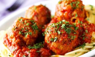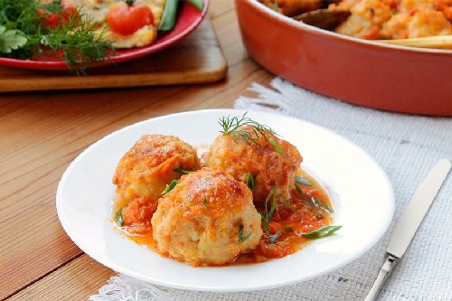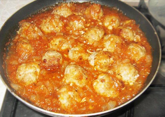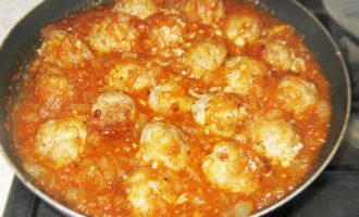- Leg de gehaktballetjes in een ovenschaal, giet de saus er gelijkmatig over en plaats ze 20-30 minuten in een voorverwarmde oven op 220 graden.