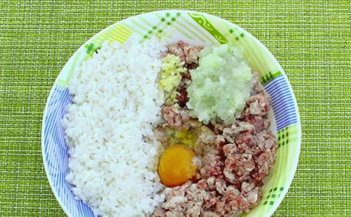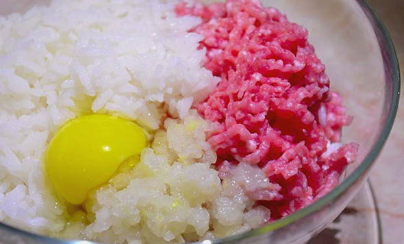 - Schil en hak een ui in een blender of vleesmolen. Meng in een kom het gehakt, de gekookte rijst, de ui en het ei, breng op smaak met zout en breng op smaak. Kneed het gehakt goed door met je handen.