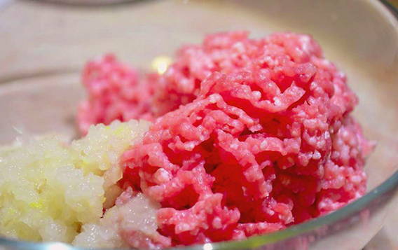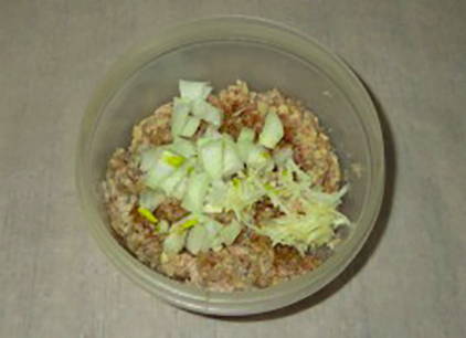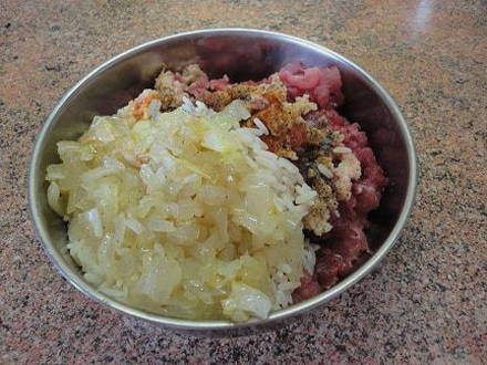 - Haal de uien door een vleesmolen en meng ze met het gehakt. Voeg ook de rol en het ei toe en breng op smaak met peper en zout. Meng de ingrediënten goed.