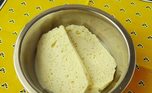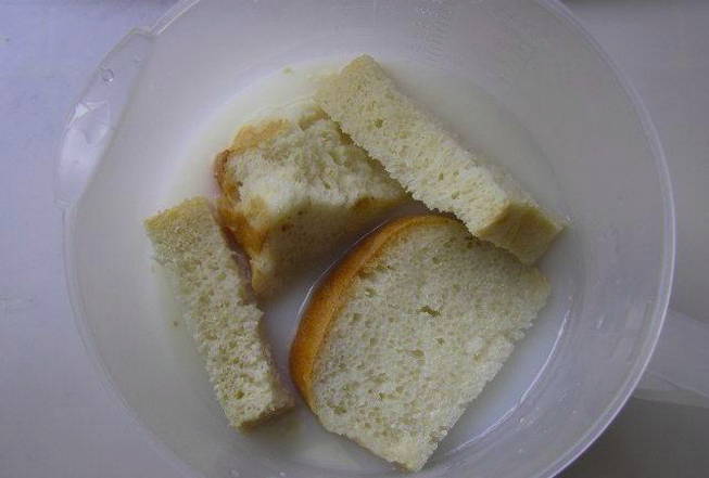 - Giet de sneetjes brood met koude melk, laat 5 minuten staan en kneed dan met je handen.