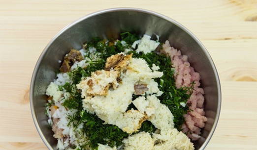 - Week het brood een paar minuten in melk en kneed het dan met je handen. Kook de rijst. Hak de ui en kruiden fijn. Meng het gehakt, de broodmassa, de rijst, de ui en de kruiden in een kom, zout en breng op smaak. Kneed het gehakt goed met je handen.