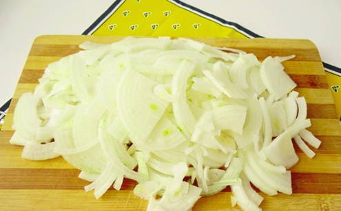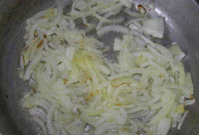 - Schil de uien, snijd ze in halve ringen en bak ze in plantaardige olie.