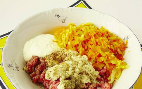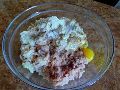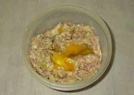 - Meng in een kom het gehakt, ¼ deel van de groentebak, zacht brood, zure room en kippenei, voeg zout en kruiden naar smaak toe, roer.