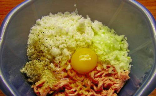 Meng in een kom het gehakt, ei, gekookte rijst, zout, gemalen peper, gesnipperde ui en knoflook.