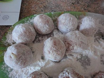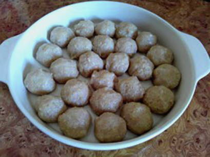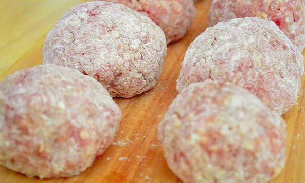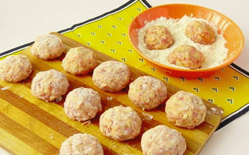 - Maak ronde gehaktballetjes van de vleesmassa, rol ze door bloem.
