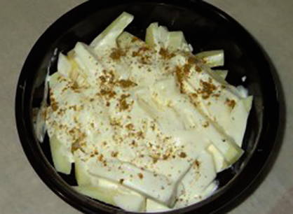 - Schil en snijd de aardappelen in dunne staafjes. Breng over naar een ovenschaal, giet er zure room over, breng op smaak en roer.