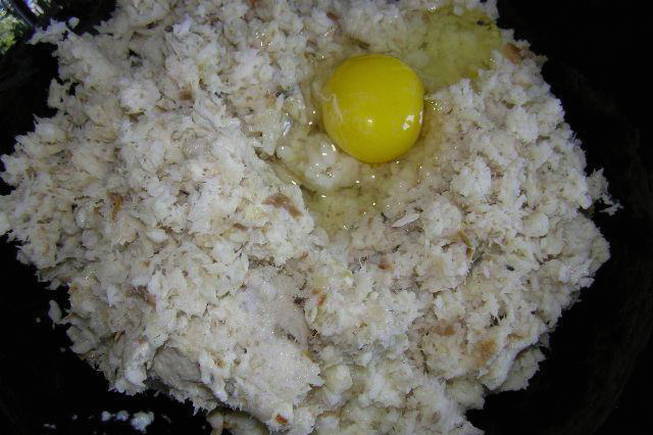 - Haal de visfilet door een vleesmolen, voeg de broodmassa, gebakken uitjes en een ei toe, zout en breng op smaak. Meng de vismassa goed.
