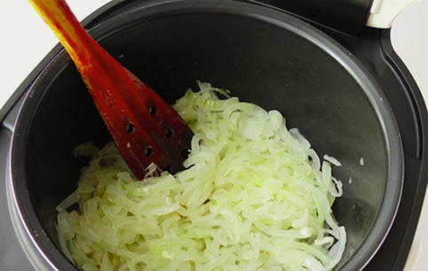 - Schakel de multicooker in, selecteer de modus "Fry" gedurende 20 minuten. Giet plantaardige olie in een kom, voeg uien toe, bak tot ze zacht zijn.