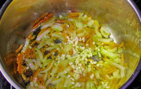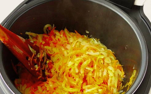 - Snijd de tweede ui in halve ringen. Rasp de wortelen. Haal de knoflook door een pers. Giet plantaardige olie in een pan en bak de uien, knoflook en wortelen tot ze zacht zijn.