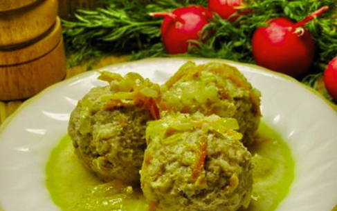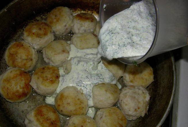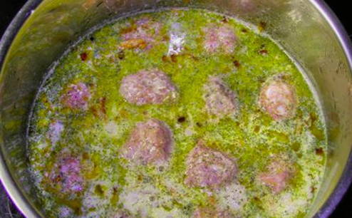 - Doe de gehaktballetjes in een pan, giet er kokend water over en laat op matig vuur 10 minuten sudderen. Voeg vervolgens een mengsel van zure room, bloem en gehakte kruiden toe aan de pan, laat nog 5 minuten sudderen.