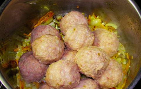 - Blinde gehaktballen van de vleesmassa, rol ze in bloem. Bak gehaktballen in een multicooker-kom goudbruin in de "Fry" -modus.