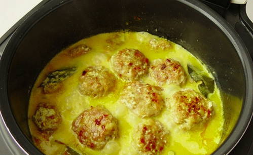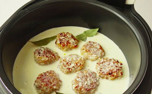 - Meng zure room en water apart in een kom, voeg naar smaak zout en gemalen peper toe. Doe de groentefrituur in de multicookerkom, dan de gehaktballetjes, giet de zure roomvulling erbij en voeg het laurierblad toe.