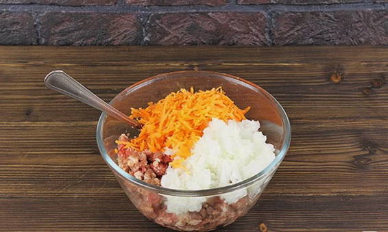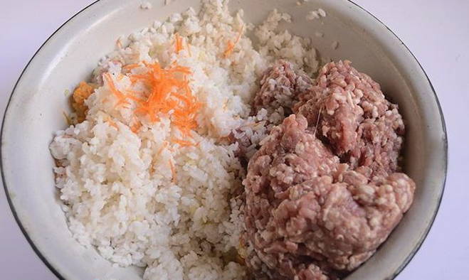 - Doe het ontdooide gehakt in een grote kom. Ook doen we hier gekookte rijst, gesnipperde uien en een kleiner deel geraspte wortel.