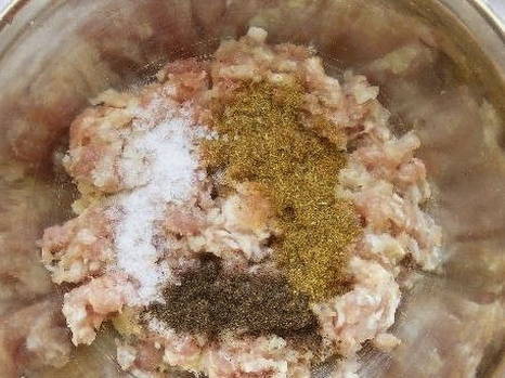 - Doe het gehakt in een diepe kom. Roer het met zout en kruiden.
