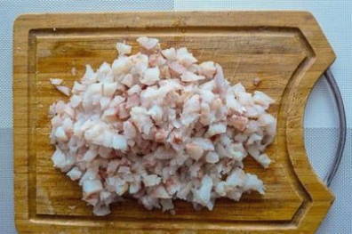 - Voorzichtig afpellen. Hak het product zelf fijn. Daarna laten we het ongeveer 5-7 minuten sudderen met gesnipperde uien, knoflook, zout, peper en suiker.