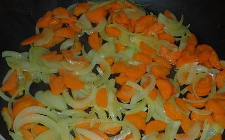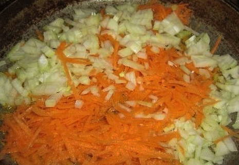 - We beginnen met koken door gesnipperde uien en geraspte wortelen te bakken. Voedsel in olie koken tot het zacht is.