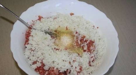 - Combineer gehakt afzonderlijk met gekookte rijst, zout en kruiden.