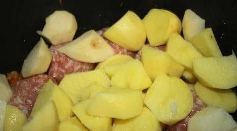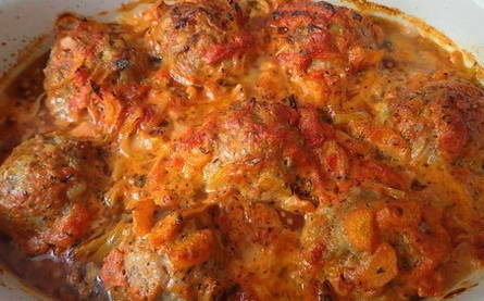 - We maken de aardappelen schoon en snijden ze in grote plakjes. Doe de groente en rauwe gehaktballen in een ovenschaal. Schenk de saus over de schaal en kook 40 minuten op 180 graden.