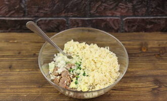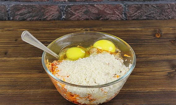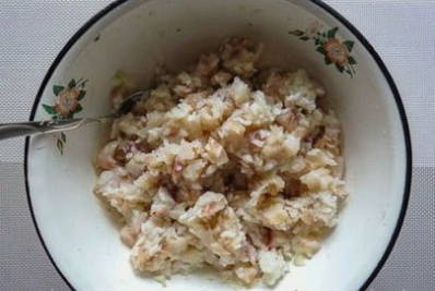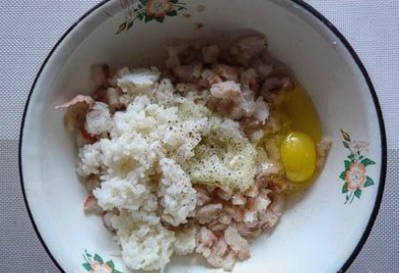 - We doen het product in een grote kom. Voeg een kippenei, gekookte rijst, gesnipperde ui en zout en peper toe.