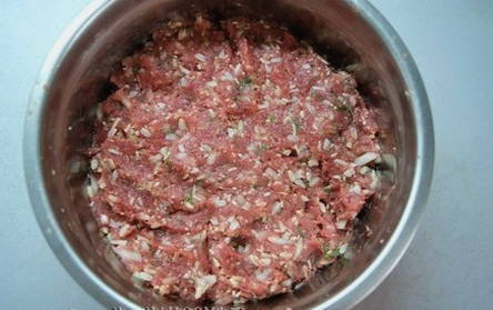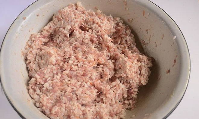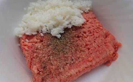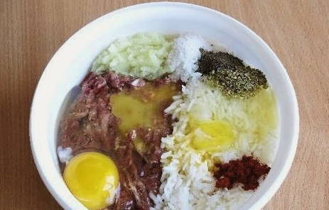 - Combineer gehakt, gekookte rijst, kippenei en de helft van de gesnipperde ui in een diep bord. Voeg zout en peper toe aan de massa en roer het door.