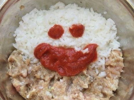 - Voeg vervolgens gekookte rijst en een derde van de tomatensaus toe. Kneed opnieuw.