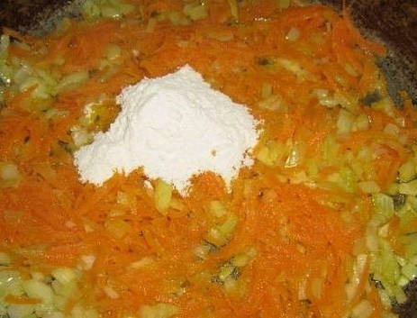 - Voeg een eetlepel bloem toe aan het frituren, roer.
