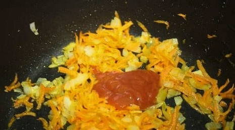 - Bak de overige uien en geraspte wortelen apart tot ze transparant zijn. Voeg tomatenpuree toe aan de groenten, roer en laat nog 5-7 minuten sudderen.