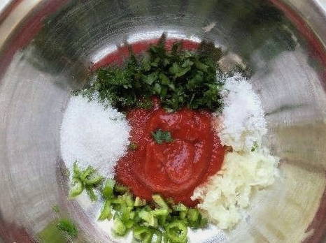 - Combineer de resterende tomatensaus afzonderlijk met suiker en zout. Doe hier gehakte kruiden en knoflookteentjes. Kneed de inhoud en vul deze met een kleine hoeveelheid gekookt water.