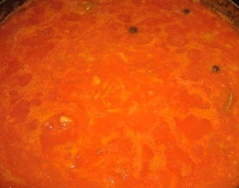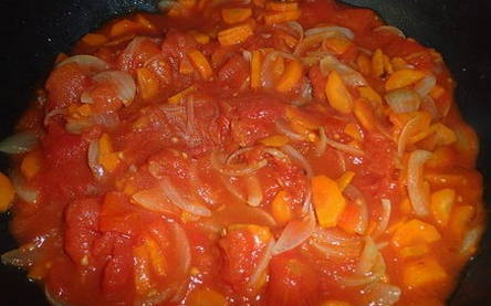 - Tomatenpuree toevoegen en in gekookt water gieten. Laat het gerecht ongeveer 40 minuten op middelhoog vuur sudderen.