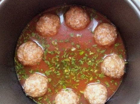 - We maken balletjes van gehakt met rijst. We doen ze in een multicookerkom en vullen ze met tomatensaus met kruiden. Koken in de "stoven" -modus gedurende 40 minuten.