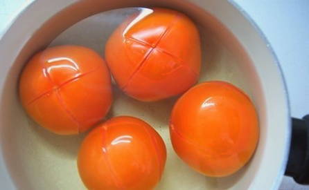 - We maken kleine inkepingen in de tomaten en verbranden ze vervolgens met kokend water.