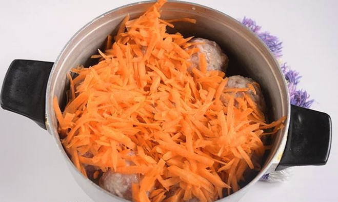 Vorm kleine balletjes van gehakt met rijst en doe ze in een pan met groenten.