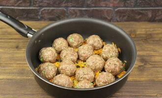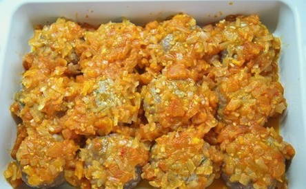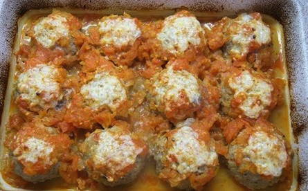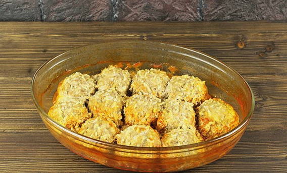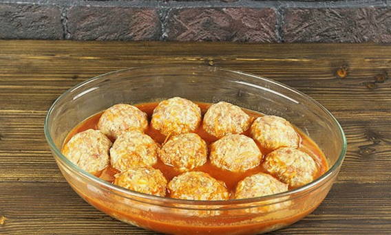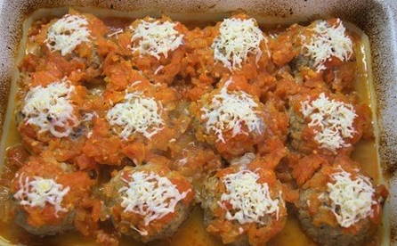 - Wij boetseren kleine balletjes van gehakt. We zetten hun ovenschaal, gieten over de bereide tomatensaus. Bak 30 minuten in een voorverwarmde oven op 180 graden.