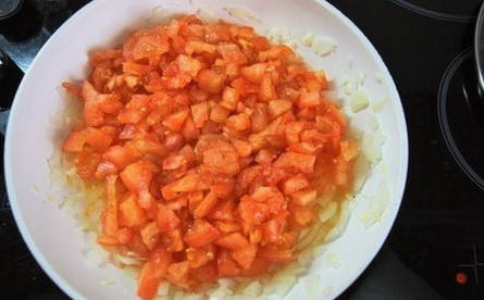 - Schenk de tomatensaus over de schaal en voeg een beetje kokend water toe. We houden het 15 minuten op laag vuur.